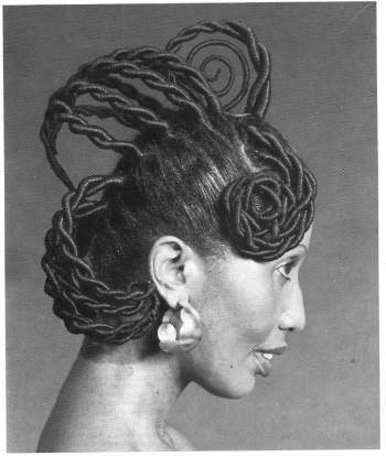 This elegant hair style has been twisted using  black thread. I believe the use of the thread twisting style originates from Central Africa.   It was very much in fashion during the 70's/80's.
